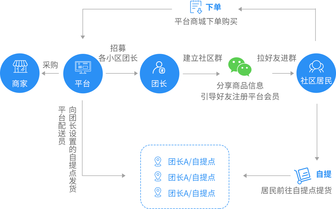 平台以社区为节点,全面打通线上线下,团长线上推广、线下交付的点对点卖货模式。