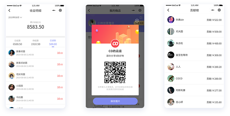 店铺管理订单、简介、贡献榜、收益明细,以数据为经营赋能