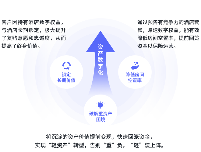 酒店资产价值的重塑者:将重资产变轻、变活,助力酒店商家快速回笼资金,保障未来的服务质量和运营发展。